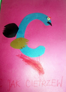 Nie było lekko z literą "c". No bo tak: czapla, czajka, chomik... C jak chomik? No, nie brzmi... Cykady odpadły, bo nie miałam pomysłu, jak je ująć w literę. Padło na cietrzew. Obejrzeliśmy zdjęcia w internecie i powstały takie ptaki: